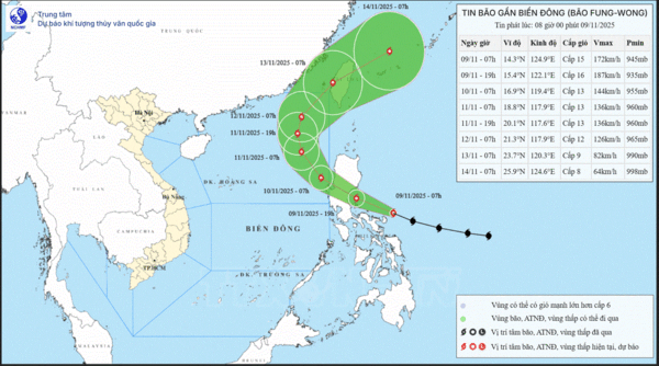 • Thời tiết ngày 9/11: Bão FUNG-WONG di chuyển nhanh và có cường độ rất mạnh