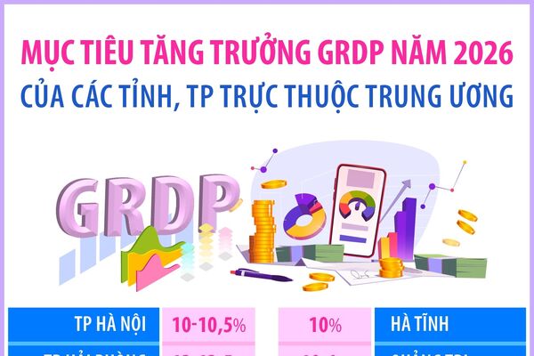 • Mục tiêu tăng trưởng GRDP năm 2026 của các tỉnh, thành phố trực thuộc Trung ương