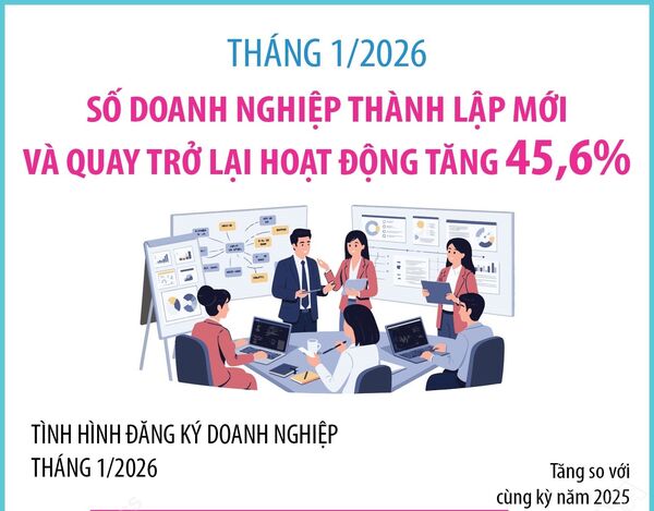 • Tháng 1/2026: Số doanh nghiệp thành lập mới và quay trở lại hoạt động tăng 45,6%