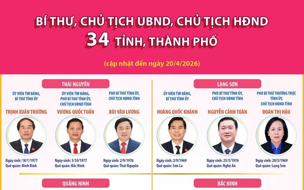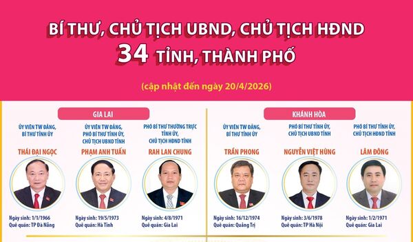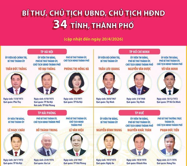 • Các đồng chí Bí thư, Chủ tịch UBND, Chủ tịch HĐND 34 tỉnh, thành phố (cập nhật đến ngày 20/4/2026) - Phần 3 và hết