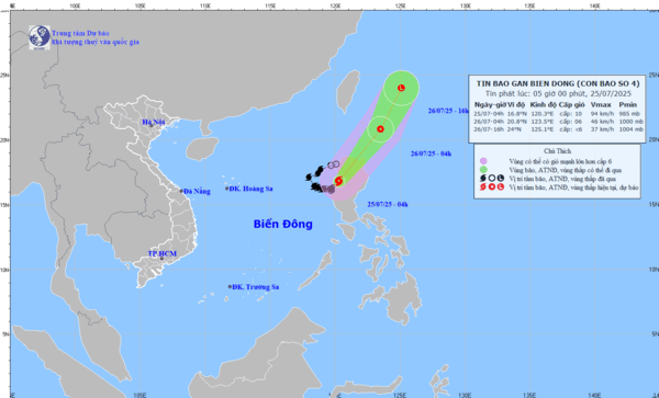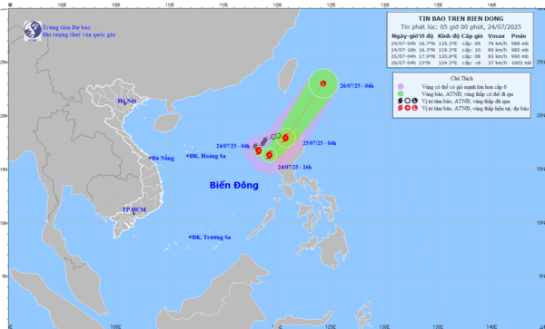 Thời tiết ngày 24/7: Bão số 4 di chuyển theo hướng Nam Đông Nam; nguy cơ lũ quét, sạt lở đất ở 5 tỉnh