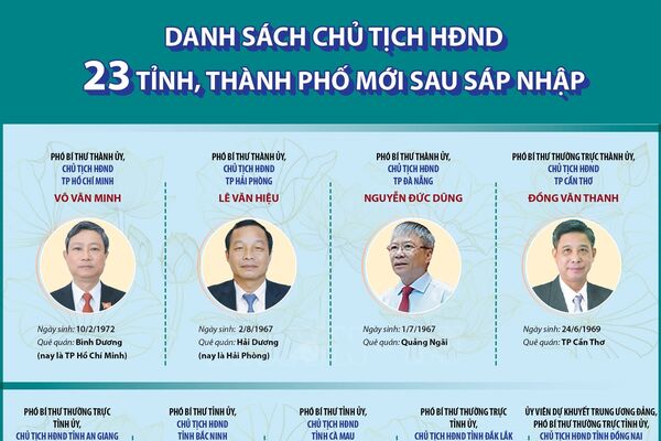 Danh sách Chủ tịch Hội đồng nhân dân 23 tỉnh, thành phố mới sau sáp nhập