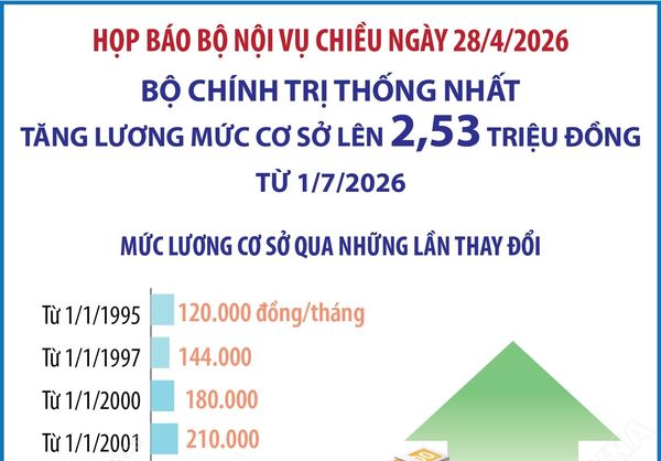 • Họp báo Bộ Nội vụ: Bộ Chính trị thống nhất tăng lương mức cơ sở lên 2,53 triệu đồng từ ngày 1/7/2026