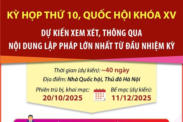 15/10/2025 20:37’ Dự kiến Kỳ họp thứ 10, Quốc hội khóa XV diễn ra từ ngày 20/10 đến 12/12.