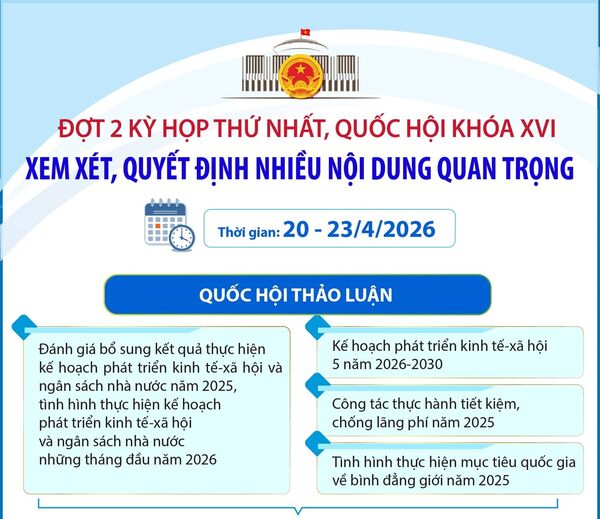 20/04/2026 08:33’ Theo chương trình, đợt 2 của Kỳ họp thứ Nhất, Quốc hội khóa XVI diễn ra từ ngày 20 đến 23/4/2026, Quốc hội xem xét, quyết định nhiều nội dung quan trọng.