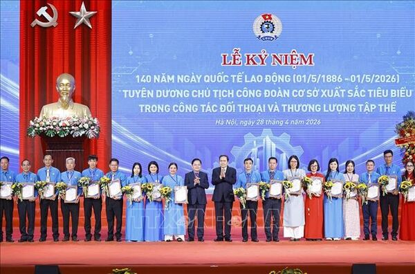 28/04/2026 12:30’ Chủ tịch Quốc hội Trần Thanh Mẫn dự Lễ kỷ niệm 140 năm Ngày Quốc tế Lao động (1/5/1886 - 1/5/2026), tuyên dương chủ tịch công đoàn cơ sở xuất sắc tiêu biểu trong công tác đối thoại và thương lượng tập thể năm 2026.