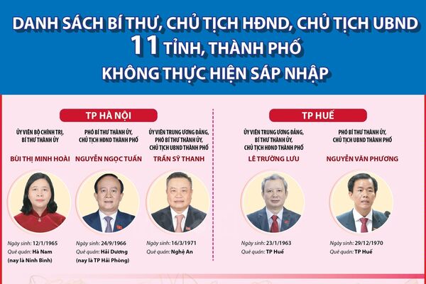 30/06/2025 13:43’ TTXVN trân trọng giới thiệu danh sách Bí thư, Chủ tịch HĐND, Chủ tịch UBND 11 tỉnh, thành không thực hiện sáp nhập.