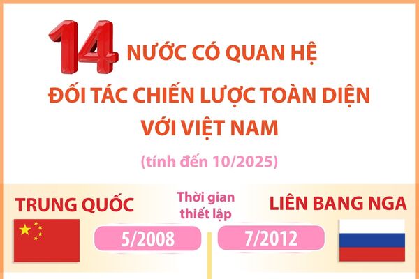 • 14 nước có quan hệ Đối tác chiến lược toàn diện với Việt Nam (tính đến 29/10/2025)
