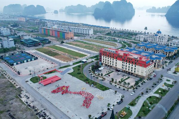 500 học sinh xếp hình bản đồ Việt Nam và lá cờ Tổ quốc bên bờ vịnh Bái Tử Long