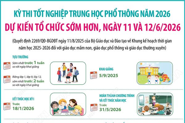 12/08/2025 16:28’ Kỳ thi tốt nghiệp Trung học Phổ thông năm 2026 dự kiến diễn ra trong ngày 11 và 12/6/2026. Việc dự kiến tổ chức sớm hơn kỳ thi phù hợp với khung kế hoạch năm học, học sinh vẫn có thời gian để ôn thi.