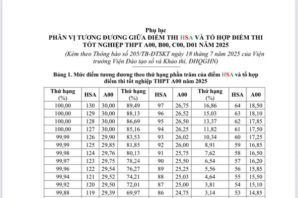 18/07/2025 18:36’ Với phương thức sử dụng kết quả thi tốt nghiệp Trung học Phổ thông năm 2025, ngưỡng đảm bảo chất lượng đầu vào của Đại học Quốc gia Hà Nội là 19 điểm.