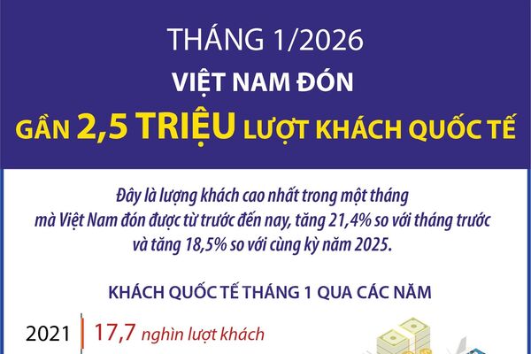 07/02/2026 16:08’ Tháng 1/2026, Việt Nam đón gần 2,5 triệu lượt khách quốc tế. Đây là lượng khách cao nhất trong một tháng mà Việt Nam đón được từ trước đến nay, tăng 21,4% so với tháng trước và tăng 18,5% so với cùng kỳ năm 2025.