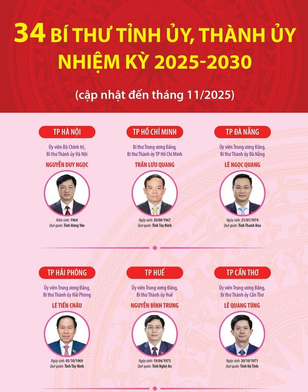 • 34 Bí thư Tỉnh ủy, Thành ủy nhiệm kỳ 2025-2030 (cập nhật đến tháng 11/2025)