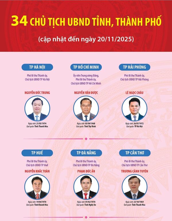 • 34 Chủ tịch UBND tỉnh, thành phố nhiệm kỳ 2021-2026 (cập nhật đến ngày 20/11/2025)