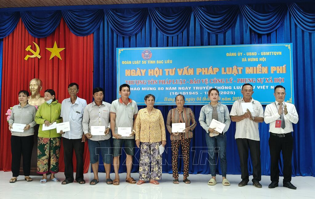 Ngày 4/10, tại xã Hưng Hội (tỉnh Cà Mau), Đoàn Luật sư tỉnh Bạc Liêu (cũ) tổ chức chương trình "Ngày hội Tư vấn pháp luật miễn phí". Đây là một trong các hoạt động hướng tới kỷ niệm 80 năm Ngày truyền thống Luật sư Việt Nam (10/10/1945 - 10/10/2025). Dịp này, Đoàn Luật sư tỉnh Bạc Liêu (cũ) trao tặng 50 suất quà cho các hộ gia đình chính sách, hộ dân tộc Khmer có hoàn cảnh khó khăn trên địa bàn xã Hưng Hội.