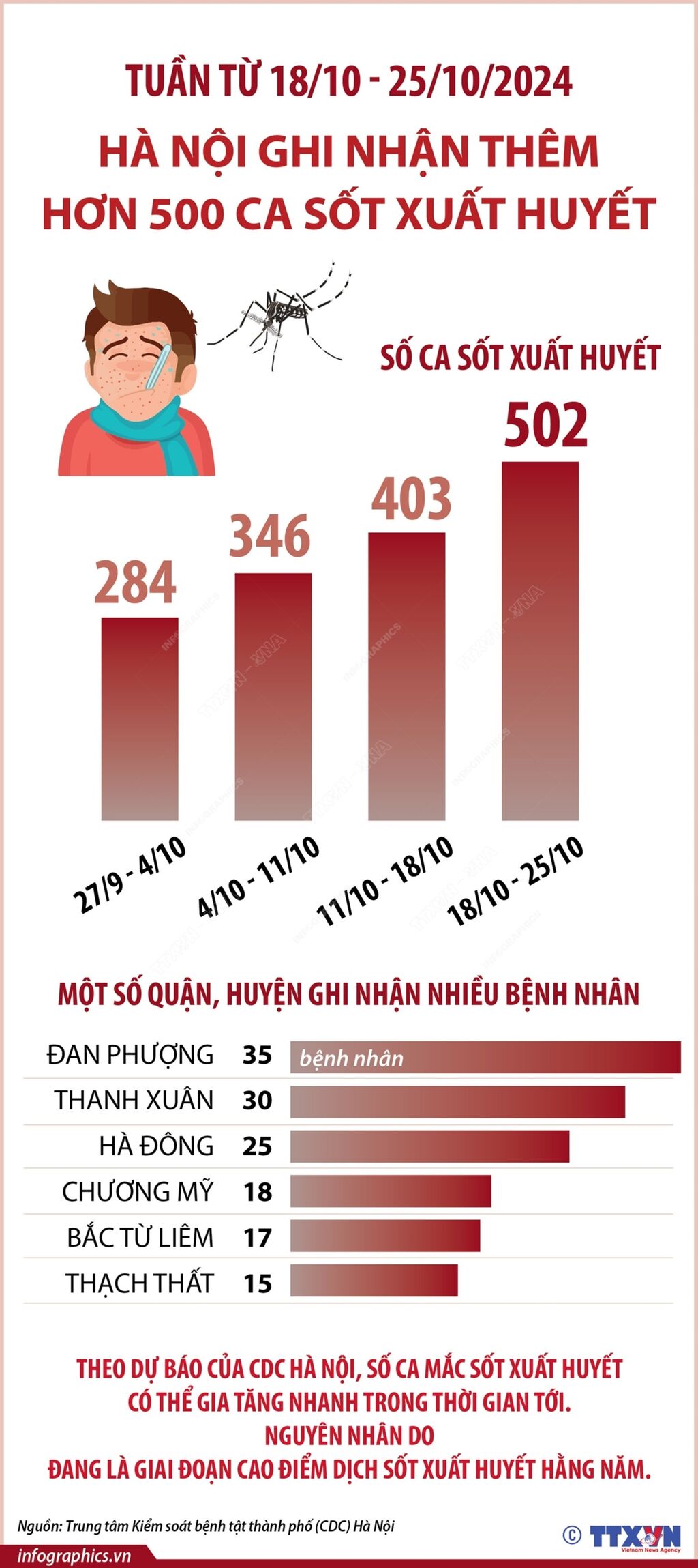 Tuần qua từ ngày 18/10 đến 25/10/2024, trên địa bàn Hà Nội ghi nhận thêm 502 ca sốt xuất huyết (tăng 99 ca so với tuần trước đó). Như vậy, cộng dồn từ đầu năm 2024 đến nay, thành phố ghi nhận 5.065 trường hợp mắc sốt xuất huyết (giảm 80,4% so với cùng kỳ năm 2023).