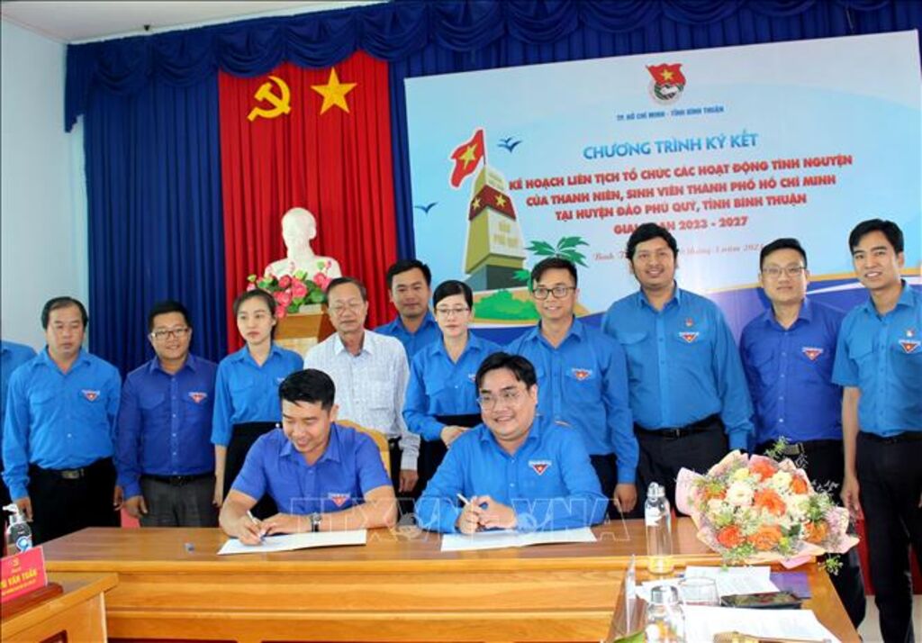 TTXVN - Sáng 10/3, tại thành phố Phan Thiết, Tỉnh Đoàn Bình Thuận và Thành Đoàn Thành phố Hồ Chí Minh tổ chức Chương trình ký kết kế hoạch liên tịch tổ chức các hoạt động tình nguyện của thanh niên, sinh viên Thành phố Hồ Chí Minh tại huyện đảo Phú Quý giai đoạn năm 2023 - 2027.