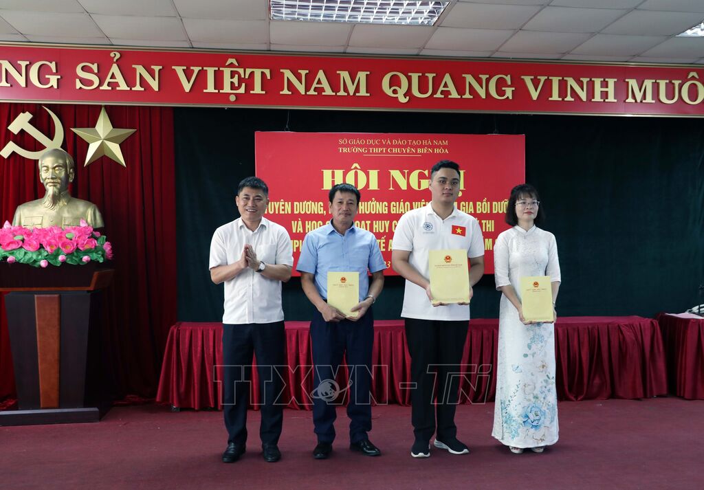 Tại buổi lễ, em Đỗ Trung Kiên và cô giáo Đinh Thị Xoan, thầy giáo Vũ Trường Giang vinh dự được tặng Bằng khen của UBND tỉnh. Đồng thời, lãnh đạo tỉnh Hà Nam đã tặng hoa, quà chúc mừng em Đỗ Trung Kiên và gia đình, chúc mừng ngành Giáo dục Hà Nam, Trường Trung học Phổ thông Chuyên Biên Hòa./.