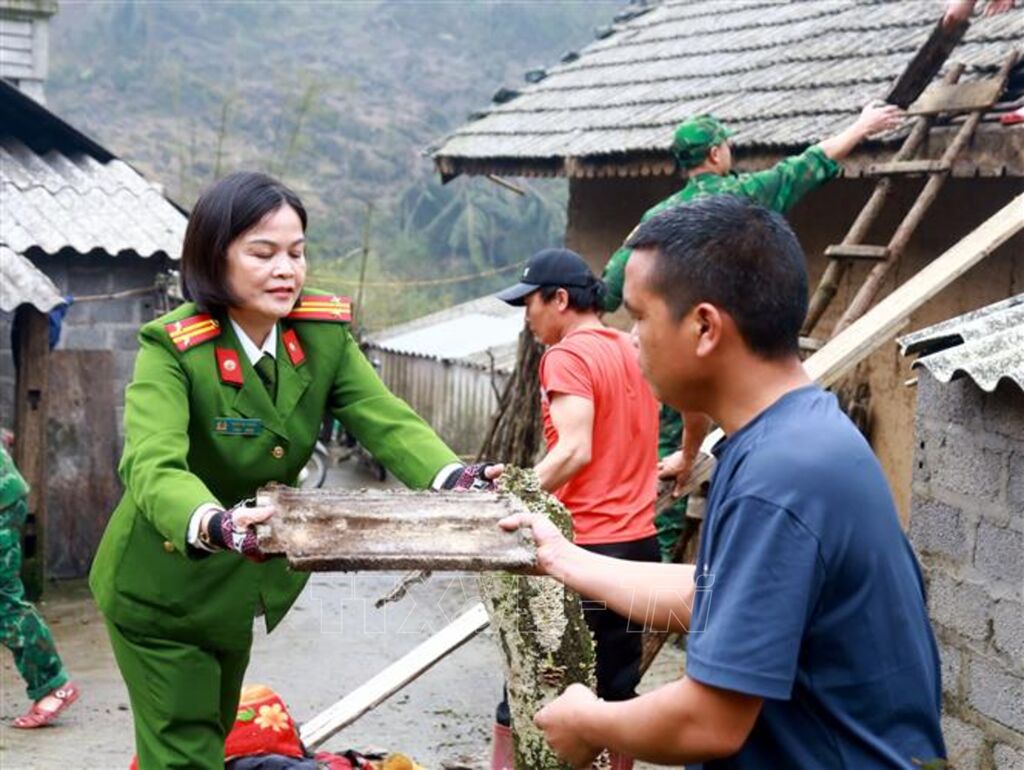 Lực lượng Công an và Bộ đội Biên phòng đóng vai trò nòng cốt, trực tiếp tham gia các phần việc nặng, nguy hiểm như tháo dỡ mái nhà bị tốc, dựng lại khung, lợp mái trong điều kiện thời tiết còn diễn biến phức tạp. Các tổ công tác cũng hỗ trợ di dời tài sản, dựng lán tạm cho các hộ bị thiệt hại nặng, bảo đảm người dân có chỗ ở an toàn trước khi hoàn thiện sửa chữa.