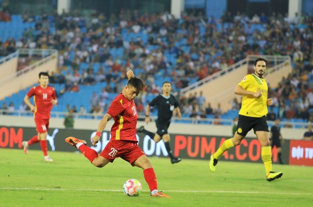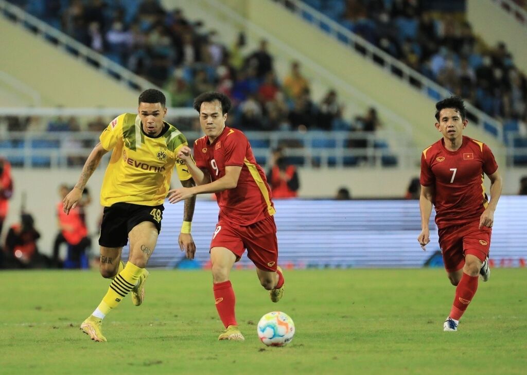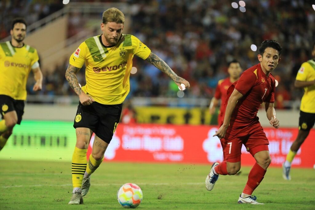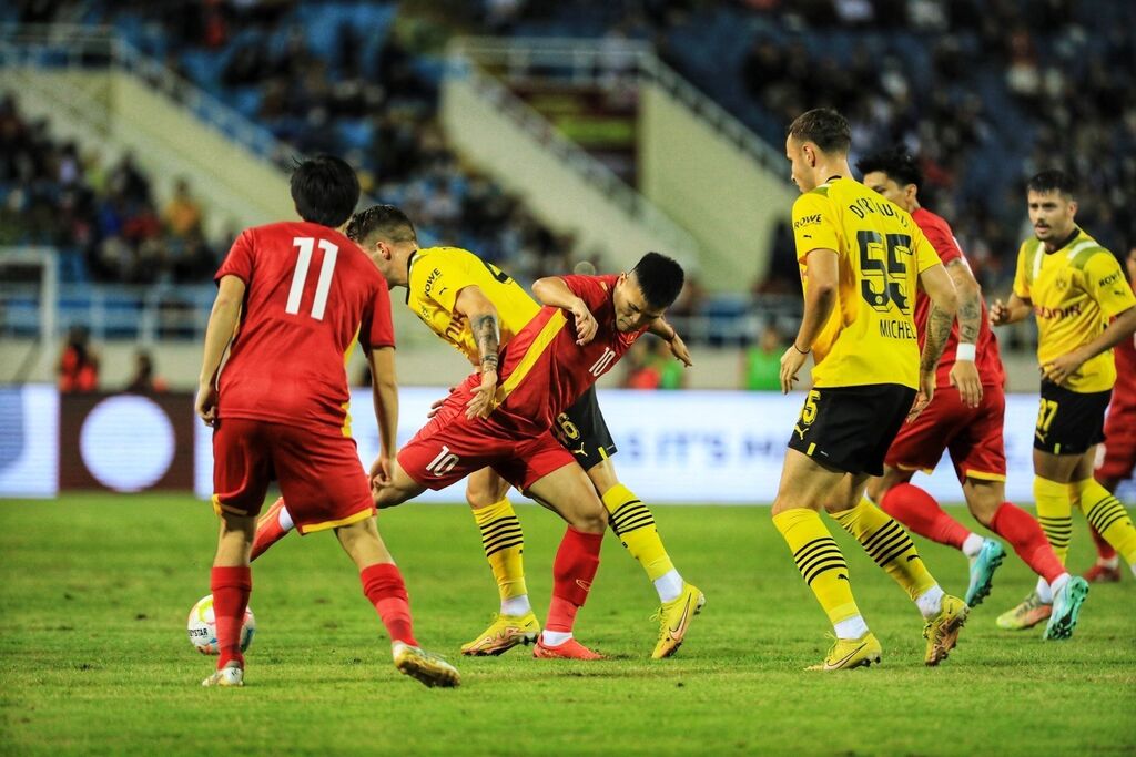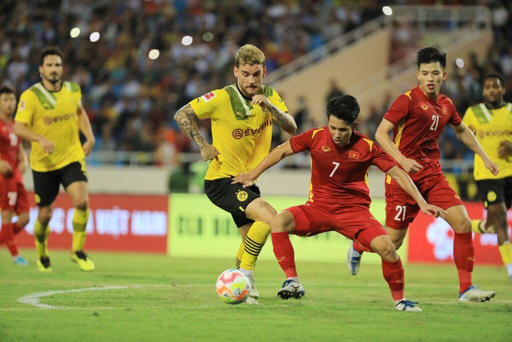 Pha tranh bóng của cầu thủ Hồng Duy (số 7, Việt Nam) với cầu thủ Borussia Dortmund. (Ảnh: Tuấn Anh/TTXVN)