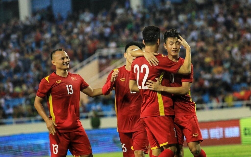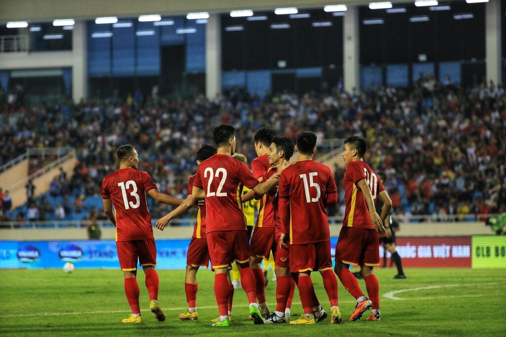 Các cầu thủ đội tuyển Việt Nam vui mừng khi tiền đạo Tiến Linh (22) ghi bàn gỡ hòa 1-1 ở phút 36. (Ảnh: Tuấn Anh/TTXVN)