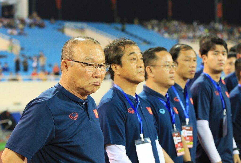 HLV trưởng đội tuyển Việt Nam Park Hang-seo và ban huấn luấn luyện. (Ảnh: Tuấn Anh/TTXVN)