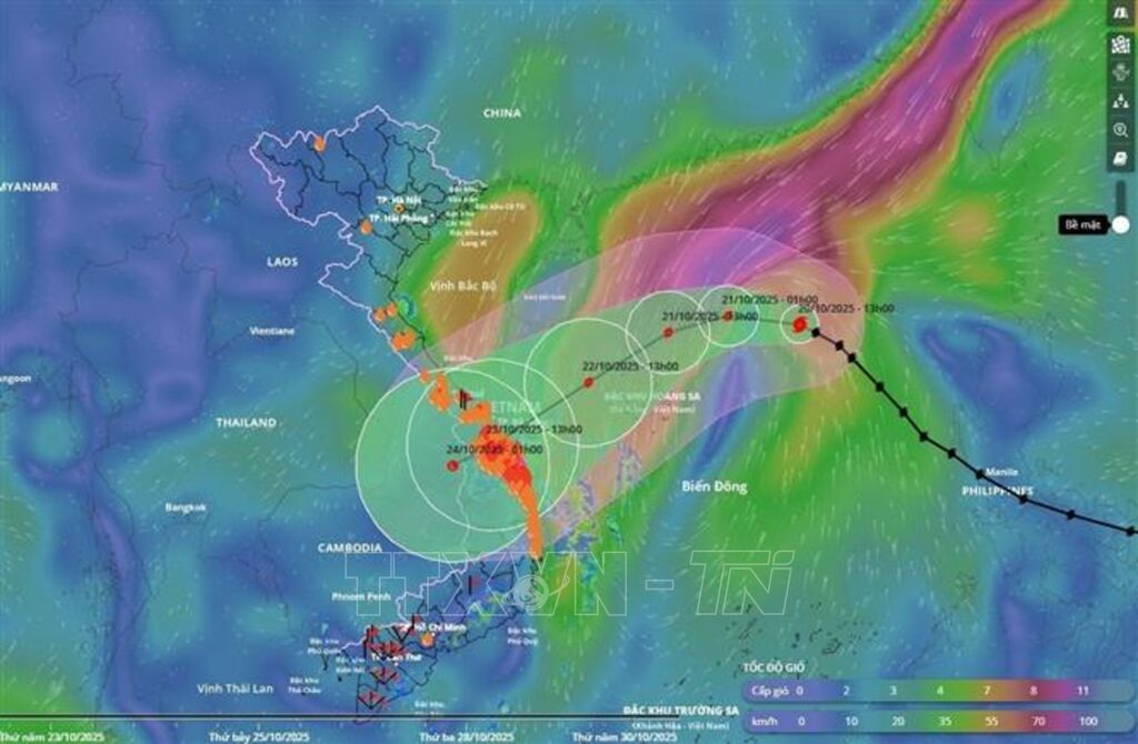 Theo dự báo của Trung tâm dự báo Khí tượng thủy văn quốc gia, trong 24 giờ tới bão di chuyển theo hướng Tây Bắc, đạt cường độ mạnh nhất cấp 11, giật cấp 13 (khi ở khu vực phía Bắc đặc khu Hoàng Sa). Do ảnh hưởng của hoàn lưu bão, kết hợp với các hình thế thời tiết khác, từ ngày 22-26/10 khu vực Trung Bộ, nhất là từ Hà Tĩnh đến Quảng Ngãi có khả năng cao xảy ra đợt mưa lớn trên diện rộng, kéo dài nhiều ngày, cục bộ có nơi mưa rất to trên 900 mm; nguy cơ cao xảy ra lũ quét và sạt lở đất ở vùng núi, ngập lụt ở các vùng trũng thấp và đô thị; lũ trên các sông từ Quảng Trị đến Quảng Ngãi có khả năng lên trên báo động 3./.