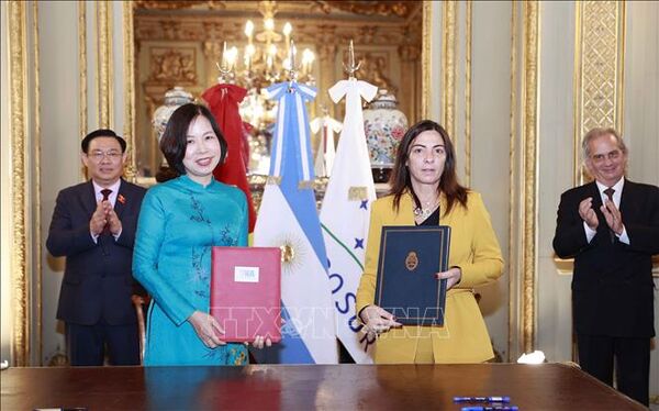 TTXVN - Theo Đặc phái viên TTXVN, sáng 27/4 theo giờ địa phương, tại trụ sở Quốc hội Uruguay, Chủ tịch Quốc hội Vương Đình Huệ đã chứng kiến Chủ tịch Thượng viện Beatriz Argimon Cedeira và Chủ tịch Hạ viện Sebastian Andujar ký Nghị quyết thành lập Nhóm Nghị sĩ hữu nghị Uruguay- Việt Nam với 8 thành viên.