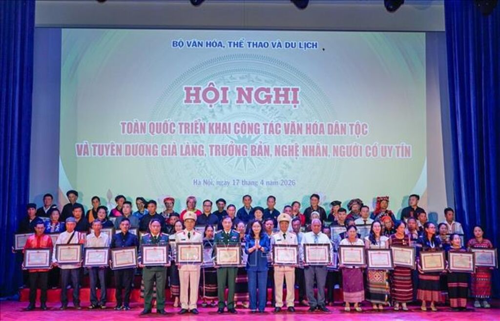 Tại hội nghị, Lãnh đạo Bộ Văn hóa, Thể thao và Du lịch đã tặng Bằng khen cho các tập thể có thành tích tham gia tổ chức sự kiện “Ngày Văn hóa các dân tộc Việt Nam” 19/4 năm 2026 tại Làng Văn hóa - Du lịch các dân tộc Việt Nam; tặng Bằng khen cho các cá nhân có thành tích tiêu biểu trong công tác bảo tồn, phát huy giá trị văn hóa truyền thống các dân tộc tại địa phương; tặng Bằng khen cho các cán bộ, chiến sĩ Công an, Quân đội có thành tích trong công tác phối hợp cùng đồng bào dân tộc thiểu số bảo tồn, phát huy giá trị văn hóa truyền thống./.