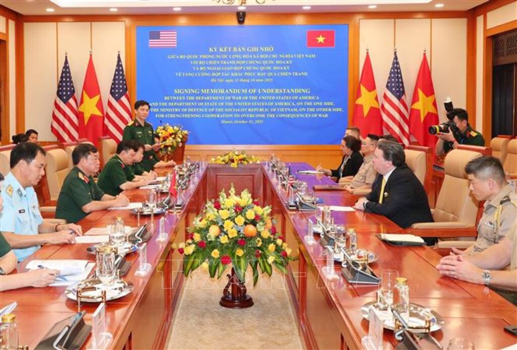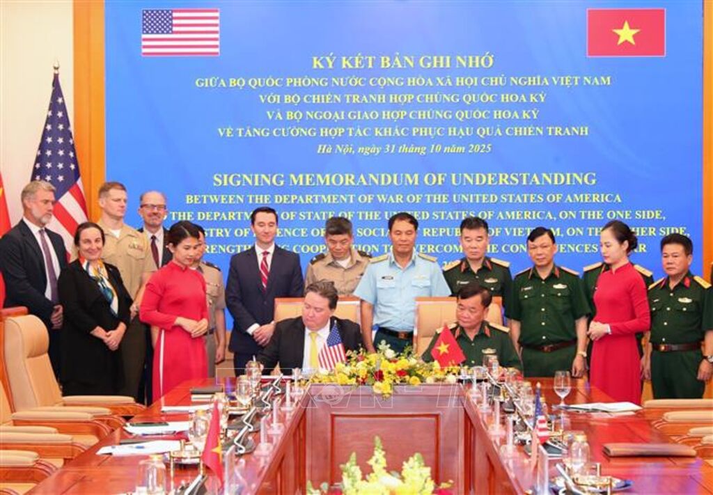 Sáng 31/10, Lễ ký kết Bản ghi nhớ giữa Bộ Quốc phòng nước Cộng hòa xã hội chủ nghĩa Việt Nam với Bộ Chiến tranh và Bộ Ngoại giao Hợp chúng quốc Hoa Kỳ về tăng cường hợp tác khắc phục hậu quả chiến tranh đã diễn ra tại trụ sở Bộ Quốc phòng (Hà Nội).
