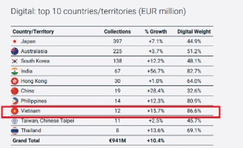 Theo báo cáo doanh thu toàn cầu về quyền tác giả năm 2025 của CISAC, Việt Nam nằm trong Top 10 quốc gia có doanh thu digital cao nhất tại khu vực châu Á - Thái Bình Dương, với tổng thu digital đạt 12 triệu Euro trong năm 2024, đứng thứ 8 trong khu vực về doanh thu bản quyền từ digital, vượt qua các thị trường như Đài Loan (Trung Quốc) và Thái Lan.