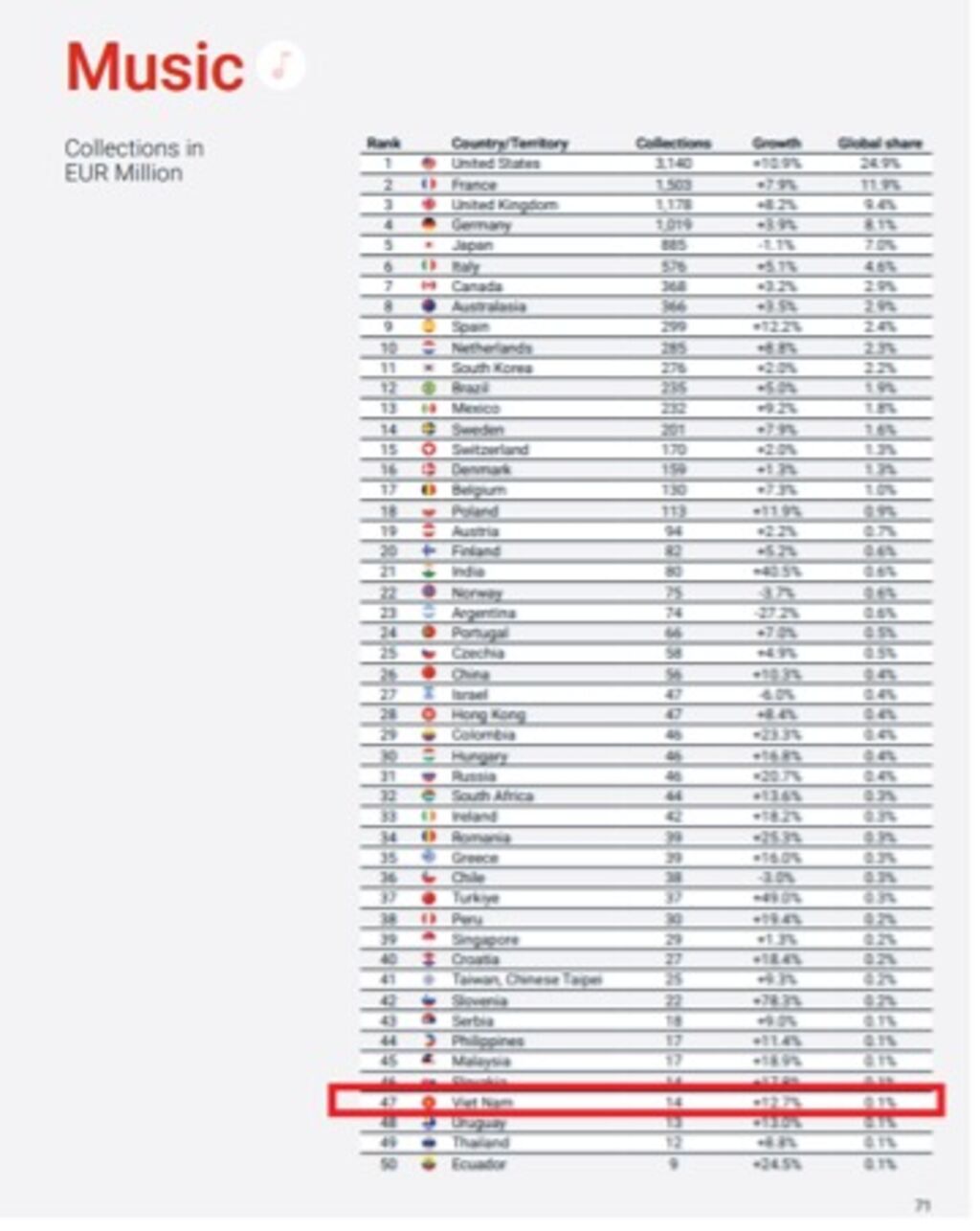 Việt Nam lọt Top 50 quốc gia có doanh thu bản quyền âm nhạc cao nhất toàn cầu và Top 10 nước có doanh thu kỹ thuật số cao nhất khu vực châu Á - Thái Bình Dương.