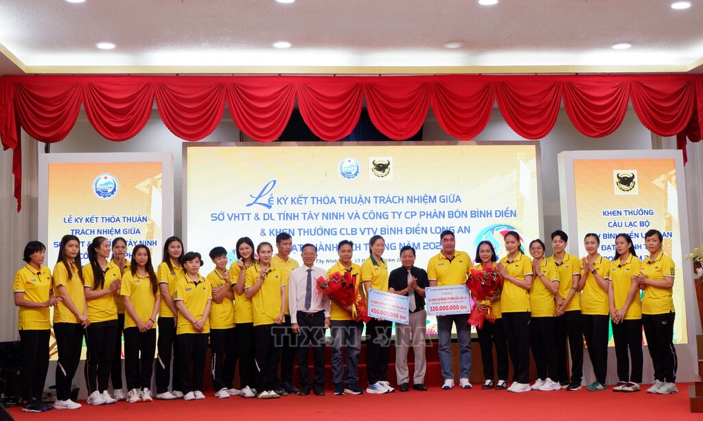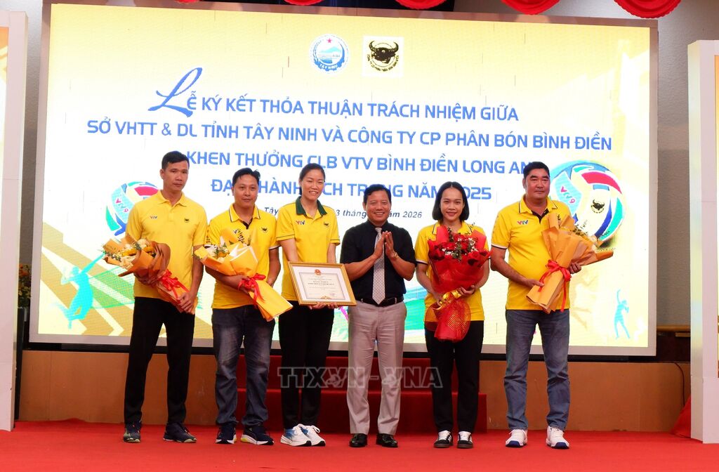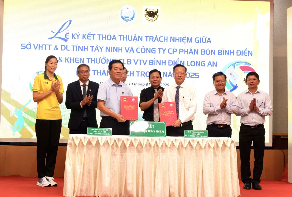 Chiều 13/1, Sở Văn hóa, Thể thao và Du lịch Tây Ninh phối hợp Công ty Cổ phần Phân bón Bình Điền tổ chức Lễ ký kết thỏa thuận trách nhiệm trong công tác quản lý, phát triển Câu lạc bộ Bóng chuyền nữ VTV Bình Điền Long An, đồng thời khen thưởng những thành tích nổi bật của câu lạc bộ năm 2025.