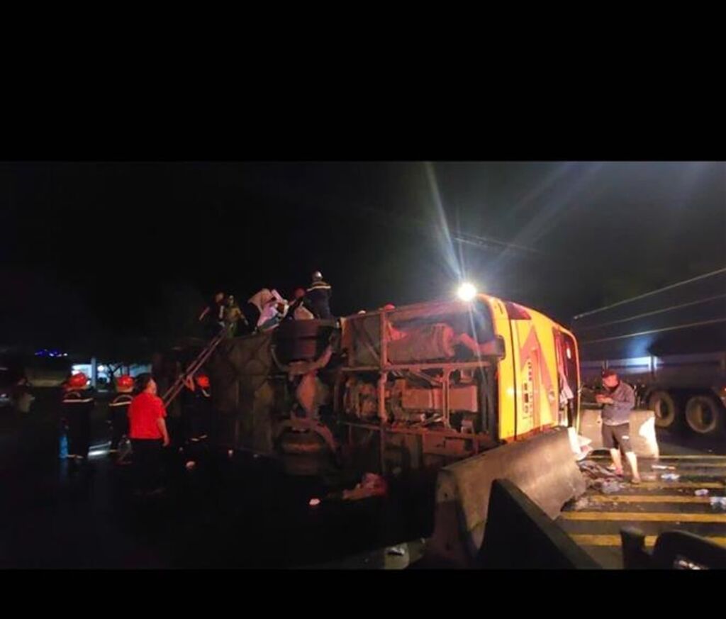 Chiếc xe khách bị lật nghiêng sau vụ tại nạn