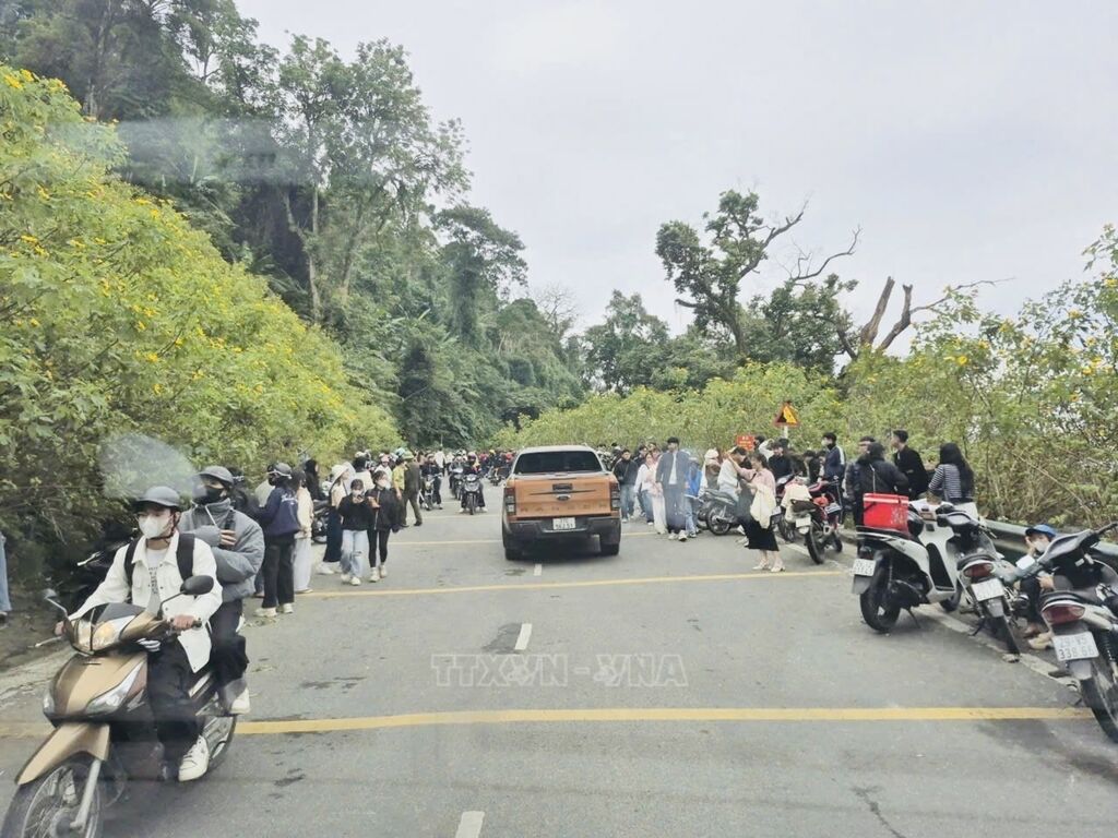 Theo ghi nhận của phóng viên TTXVN, lúc 8 giờ ngày 16/11, khu vực quanh đường dẫn lên Vườn Quốc gia Ba Vì đã có hàng nghìn người, chủ yếu là các bạn trẻ tập trung săn mây và chụp ảnh kỷ niệm với hoa dã quỳ.