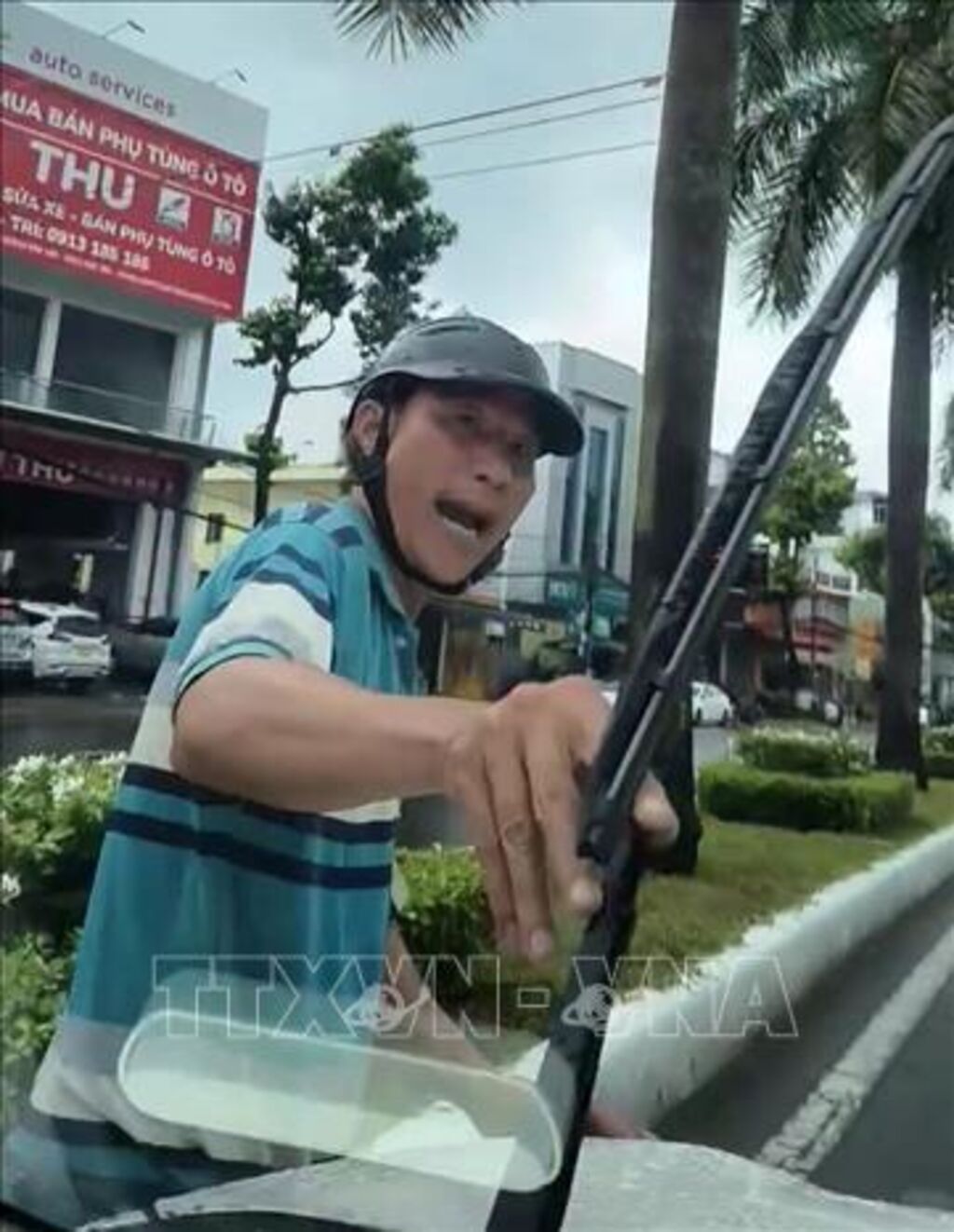 Theo nội dung đoạn clip, một người đàn ông trung niên mặc áo thun, quần đùi, đi xe máy biển số tỉnh Tiền Giang chặn trước đầu xe ô tô đang di chuyển trên đường 3 Tháng 2. Khi ô tô dừng lại, người đàn ông bước lại đập tay vào cửa kính và liên tục chửi mắng, dùng tay đập kính chiếu hậu hai bên và bẻ hai cần gạt nước mưa phía trước ô tô.