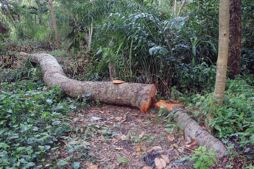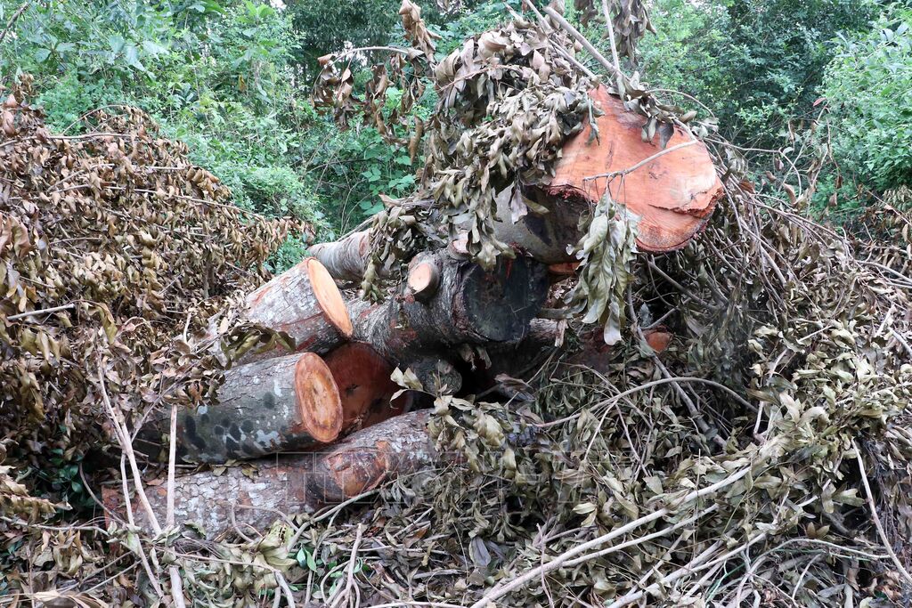Hiện trường cho thấy nhiều đoạn thân cây còn nằm ngổn ngang hai bên đường. Một vài gốc cây sau khi chặt được che đậy tạm bằng đất, cỏ và lá cây.