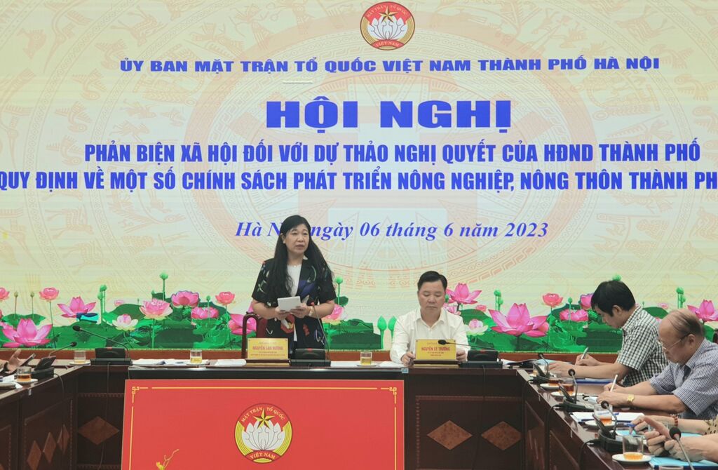 Theo Chủ tịch Ủy ban Mặt trận Tổ quốc Việt Nam thành phố Hà Nội Nguyễn Lan Hương, dự thảo đã bám sát các căn cứ pháp lý, pháp luật của Nhà nước, chỉ đạo của Trung ương, thành phố và nhất là đáp ứng yêu cầu thực tiễn phát triển Thủ đô, đảm bảo an sinh xã hội. Bà Nguyễn Lan Hương lưu ý Sở Nông nghiệp và Phát triển nông thôn, các cơ quan chuyên môn trong quá trình xây dựng dự thảo cần rà soát, tính toán kỹ, để nghị quyết khi ban hành thực sự đi vào đời sống, góp phần phát triển nông nghiệp, nông thôn trên địa bàn thành phố.