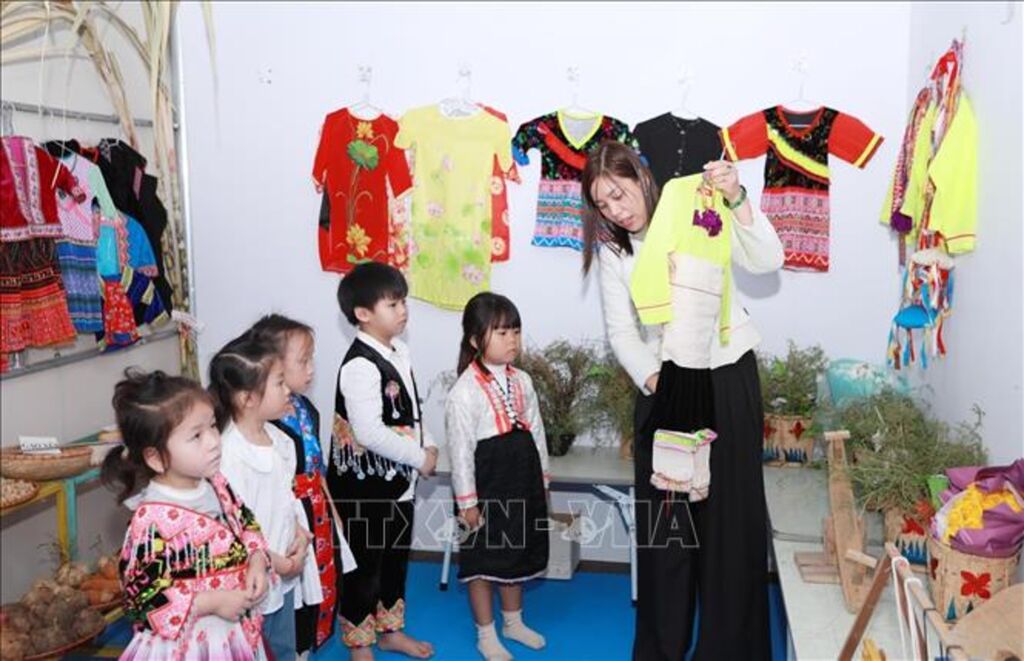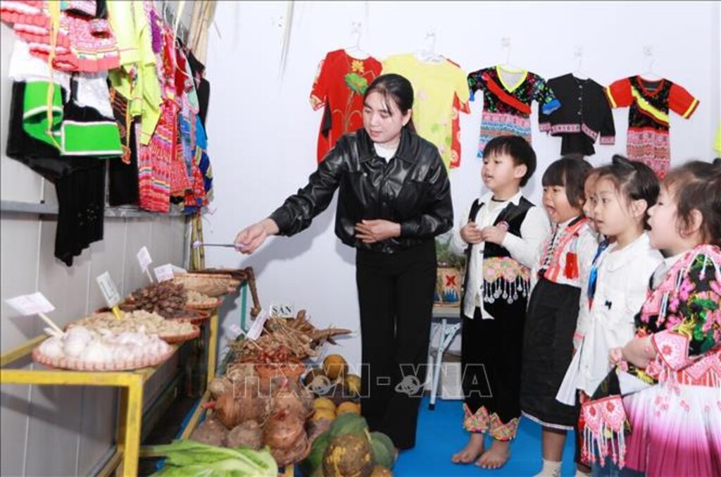Với sự khéo léo của các cô giáo vùng cao, không gian bảo tồn văn hóa của các dân tộc được sắp xếp khoa học với nhiều đồ dùng quen thuộc trong cuộc sống. Mọi vật dụng hàng ngày, từ cái bát, đôi đũa đến những nông cụ sản xuất như cái gùi, cái cuốc, hay các nhạc cụ dân tộc, sản phẩm nông sản gắn với đời sống hàng ngày đều được dán nhãn ghi tên bằng tiếng Việt. Việc gắn tên cụ thể, rõ ràng, giúp trẻ hình thành phản xạ tự nhiên khi nhìn vào vật thể là nhớ đến tên gọi.