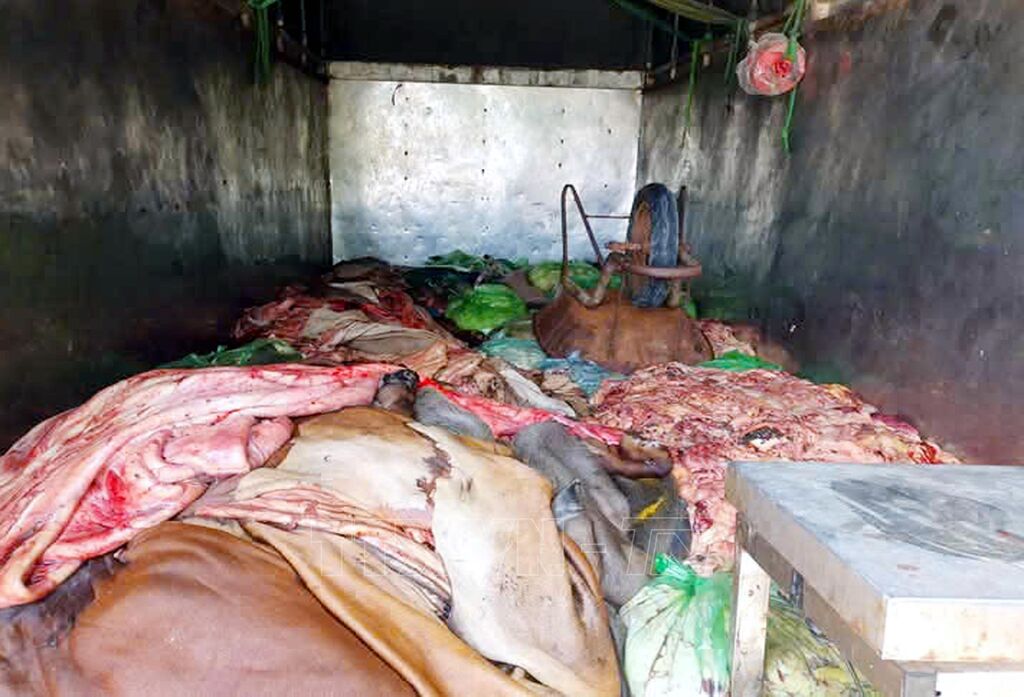 Ngày 6/6, Công an tỉnh Hà Tĩnh cho biết, vào lúc 9 giờ cùng ngày, Phòng Cảnh sát kinh tế phối hợp với Phòng Cảnh sát giao thông Công an tỉnh và Công an xã Đan Trường, huyện Nghi Xuân bắt giữ tài xế Lê Văn Hưng (sinh năm 1987, trú tại huyện Thọ Xuân, tỉnh Thanh Hóa) điều khiển xe tải biển kiểm soát 35H-000.18, chở 1,1 tấn da, lòng, mỡ động vật không có giấy tờ hợp lệ.