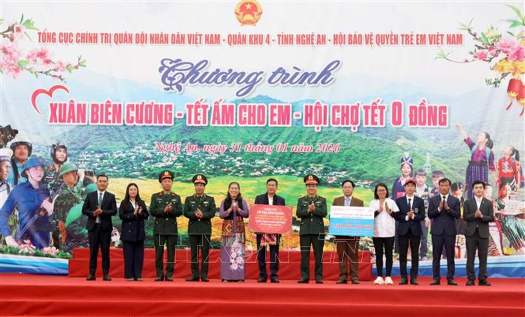 Trong hai ngày 30-31/1, tại xã Tam Thái (Nghệ An), Tổng cục Chính trị Quân đội nhân dân Việt Nam phối hợp cùng Quân khu 4, tỉnh Nghệ An và Hội Bảo vệ Quyền trẻ em Việt Nam tổ chức chương trình “Xuân biên cương - Tết ấm cho em – Hội chợ Tết 0 đồng”. Đây là hoạt động trọng điểm nằm trong chuỗi sự kiện “Xuân biên cương, hải đảo - Tết thắm tình quân dân” nhân dịp Tết Nguyên đán Bính Ngọ 2026