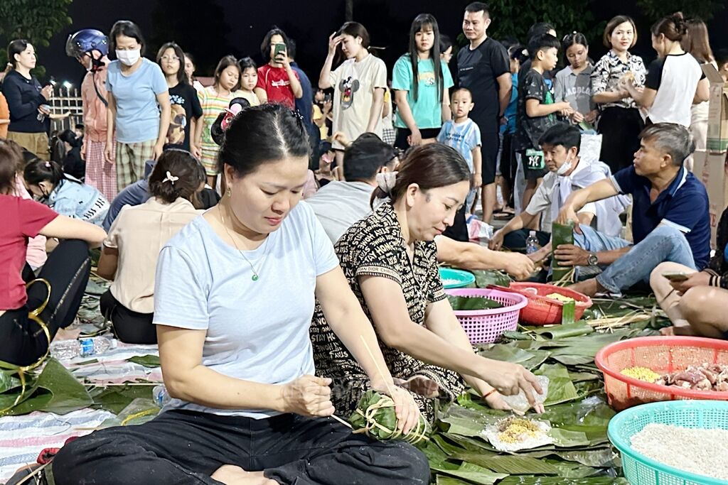 Đặc biệt, từ chiều 22 đến rạng sáng 23/11, hàng trăm người già, cựu chiến binh, thanh niên, phụ nữ, trẻ em đã tập trung trước sân để gói bánh chưng, bánh tét.