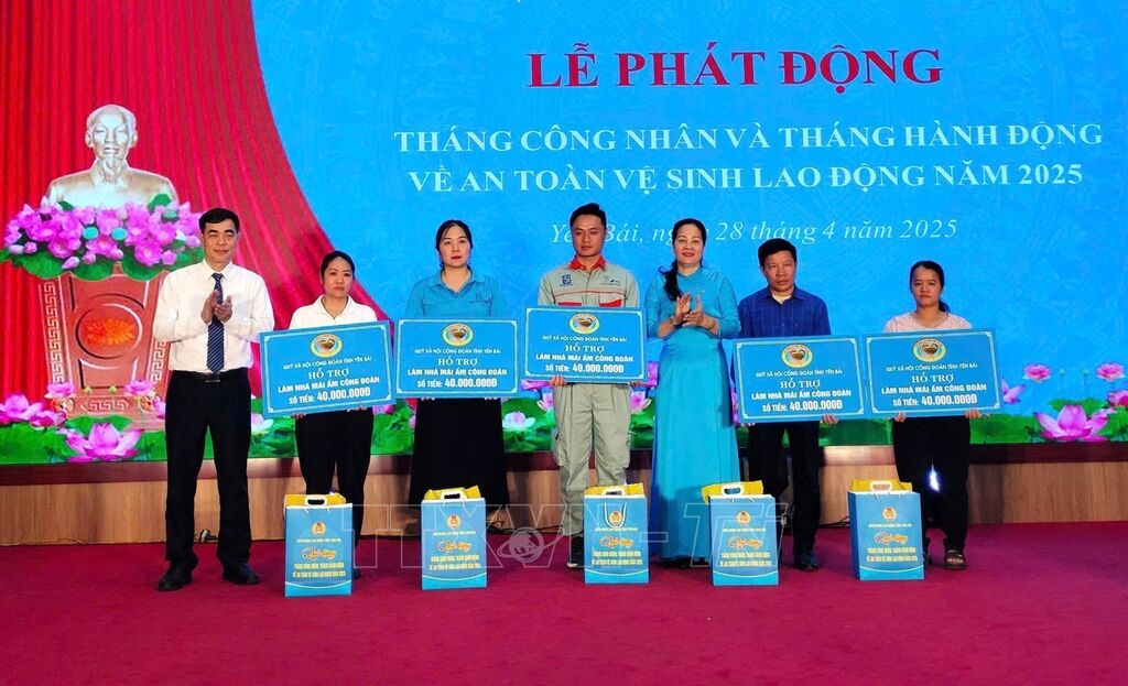 Liên đoàn Lao động tỉnh Yên Bái hỗ trợ 546 suất quà với giá trị 346 triệu đồng và trao 41 nhà Mái ấm Công đoàn với số tiền 1,8 tỷ đồng cho đoàn viên, công nhân lao động có hoàn cảnh khó khăn, đoàn viên bị tai nạn lao động. Báo Tuổi Trẻ hỗ trợ làm 10 nhà Mái ấm Công đoàn cho công nhân, người lao động có hoàn cảnh khó khăn với kinh phí 500 triệu đồng (mỗi nhà 50 triệu đồng) và tặng 200 suất quà (mỗi suất 1 triệu đồng) cho đoàn viên, công nhân lao động tỉnh Yên Bái. Liên đoàn Lao động thành phố Hải Phòng hỗ trợ làm 6 nhà Mái ấm Công đoàn, mỗi nhà số tiền 50 triệu đồng với tổng kinh phí 300 triệu đồng./.